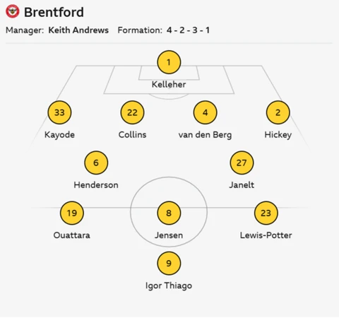 Brentford XI : Kelleher, Kayode, Van den Berg, Collins, Hickey, Henderson, Jensen, Lewis-Potter, Ouattara, Janelt, Thiago.