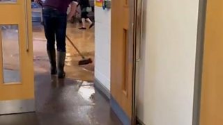 El Centro Comunitario Beacon en Exeter pidió voluntarios para ayudar a barrer el agua después de la inundación.